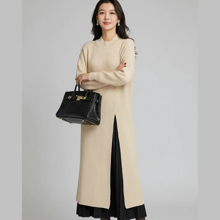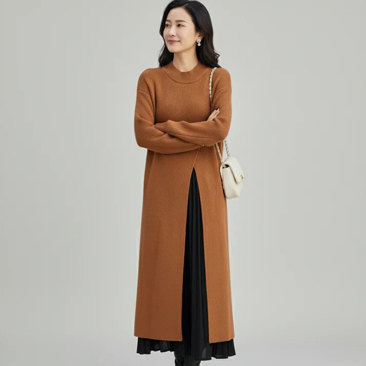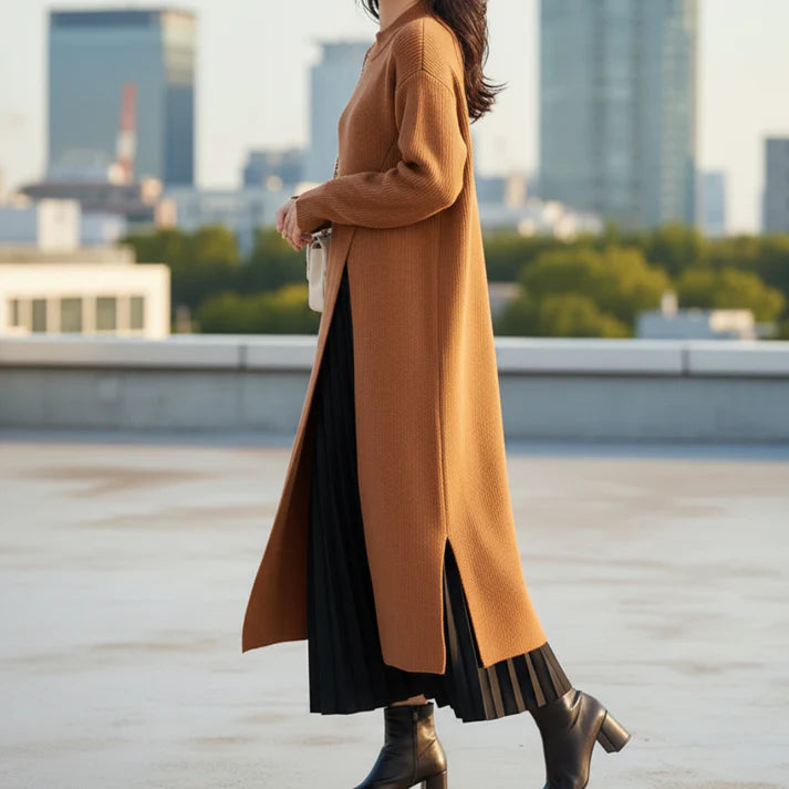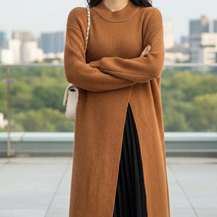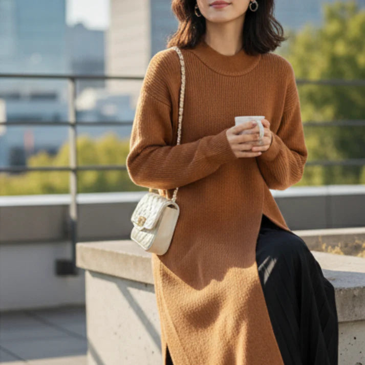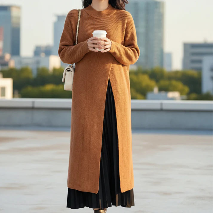 ラウンドネック入りスリット入りニットワンピースは、計算されたスリットデザインで縦ラインを強調し、自然に視線を逸らしてくれます。 優しいリブ編みが身体のカーブを優しく包み、気になる部分もさりげなくカバー。